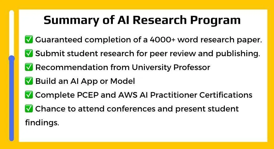 The 12-week Research on AI, ML, NLP and Robotics where the student will conduct research and write a scientific paper guided by a University Professor.High school students will receive expert guidance to craft a comprehensive research paper exceeding 4000 words, ready for submission to esteemed academic journals.